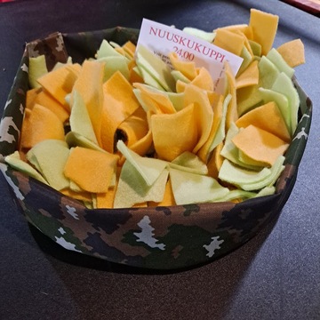 Valmistamme pienimuotoisesti leluja, nuuskukuppeja, nuuskumattoja sekä namipalloja.